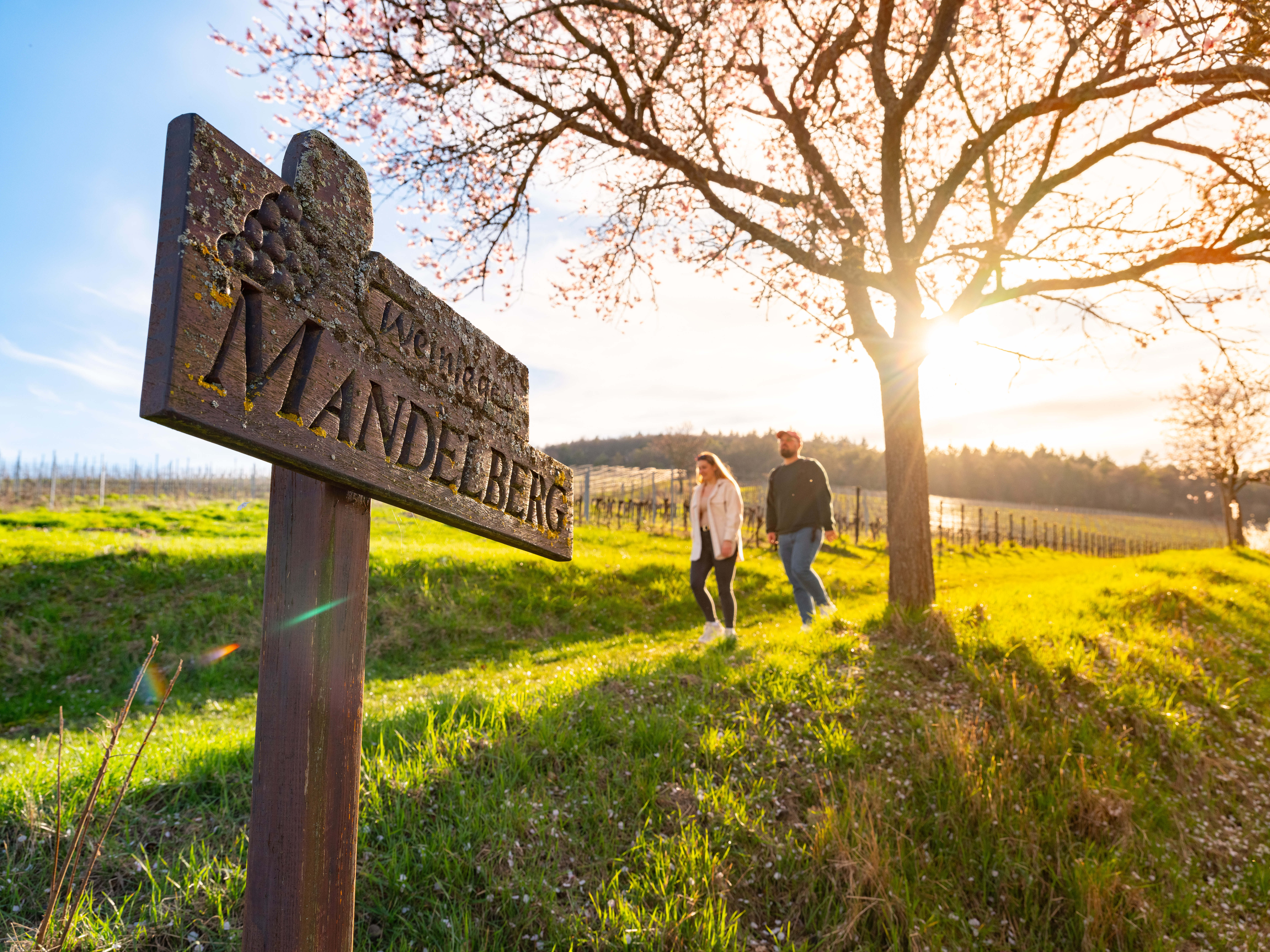 Der Pfälzer Mandelpfad verläuft über rund 100 Kilometer – von Bockenheim bis Schweigen-Rechtenbach. Wer ins Blütenmeer eintauchen möchte, nimmt sich am besten die sechste Etappe vor. Zugegeben: Sie gehört nicht zu den kürzesten, jedoch zu den schönsten. Und Bewegung schadet bekanntlich nach